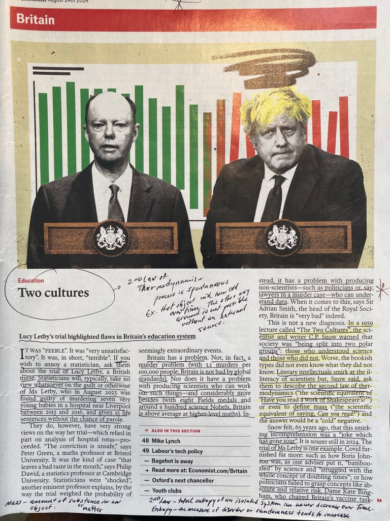 An article in The Economist about Lucy Letby’s trial in the UK highlighted flaws in Britain’s education system. It referenced a 1959 lecture, “The Two Cultures,” in which scientist and author C.P. Snow warned about society splitting into two groups: those who understand science and those who don’t. Snow noted that while literary intellectuals might smirk at scientists’ illiteracy, many couldn’t describe the Second Law of Thermodynamics—the scientific equivalent of asking, “Have you read a work of Shakespeare?” This divide became relevant in Letby’s case, as lawyers struggled to grasp the statistical and scientific evidence about whether she was on duty when a number of babies died. You can read more about her case here.