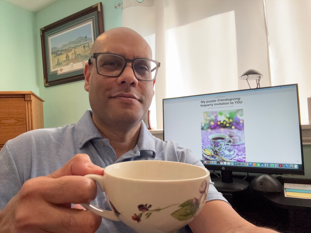 My friend Linda, from The Mindful Migraine Blog, celebrated her 2nd blog anniversary on 17 January 2026. She’s actually having a Purple Friendsgiving (Virtual) Tea Party on the 21st and 22nd of February. I told her that I would be out of town that weekend but that I would be celebrating with her and others in spirit. I really wanted to be part of the celebration, so the photo below is my attempt to show her my celebratory spirit.